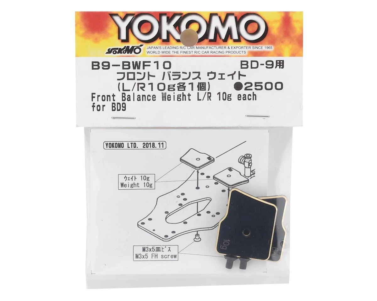 Yokomo BD9 Front Balance Weight. These optional front chassis weights install behind the front bulkhead, on the right and left side of the chassis. Package includes two 10 gram weights.