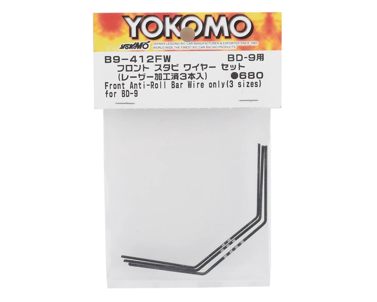 Yokomo BD9 Front Stabilizer Wire Set. Package includes three sway bars that can be used to tune the car to suit various track conditions.