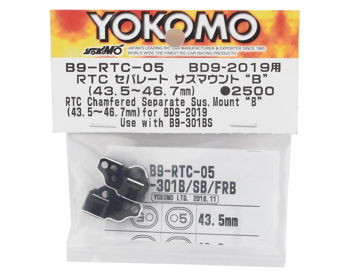 Yokomo BD9 RTC Separate Suspension Mount “B”. This is a replacement for BD9 models equipped with the Yokomo RTC Rear Toe Control System (YOKB9-RTC). Package includes two suspension mounts.