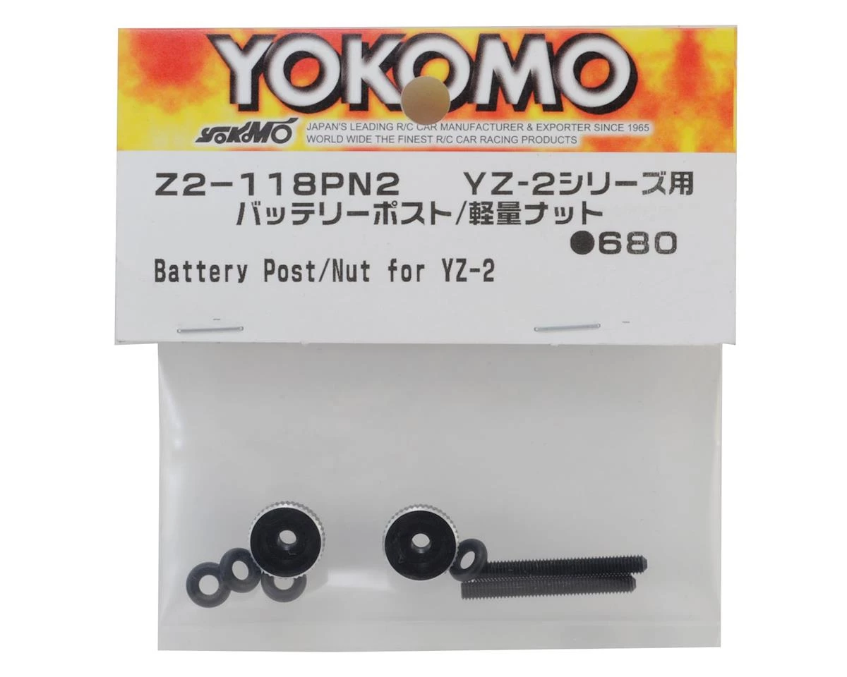 Yokomo YZ-2 Light Weight Battery Post Nuts. Package includes two battery strap hold down nuts, two set screws and four o-rings.